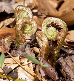 Common throughout in shaded locations, Christmas Fern is evergreen (hence its common name). The fronds are once-divided and semi-erect until the first frost, after which they lie flat on the ground. The pinnae (leaflets) are lance shaped with a basal lobe on their upper side (supposedly looking like a Christmas stocking); the edges of each pinna are serrated with bristles at their tip. Silvery fiddleheads emerge in early spring. On fertile fronds, the length of the pinnae are shorter starting about 1/2 to 2/3 up the blade.