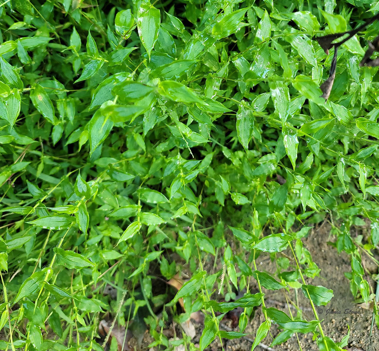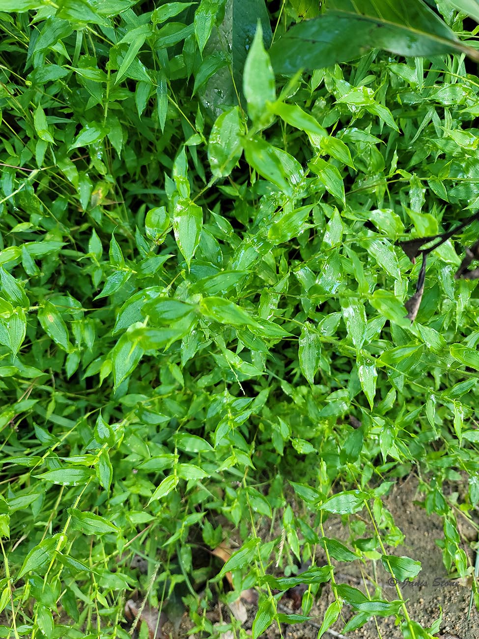 Small Carpetgrass is sometimes confused (especially before flowering) with Japanese Stiltgrass (Microstegium vimineum) and Wavyleaf Basketgrass (Oplismenus undulatifolius). Small Carpetgrass has distinctly cordate-clasping leaves, which Japanese Stiltgrass lacks. Also, while the leaves of Wavyleaf Basketgrasss may superficially appear to be cordate-clasping, they are not, plus they are more undulate.