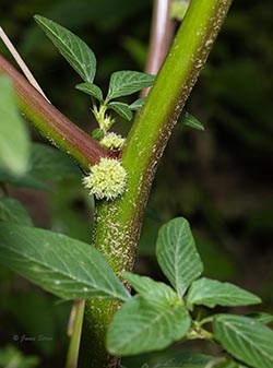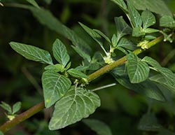 Spiny Amaranth, true to its common name, has spikes present on the flowers and spines present at nodes. Its flowers are green, lack petals, and have terminal and axillary spikes. Male flowers are at the end of the flower spike, while the female flowers are at the bottom.