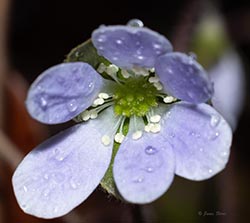 Round-lobed Hepatica flowers range in color from blue/violet (most common) to white. New leaves start out bright green, then turn mottled and eventually darker.