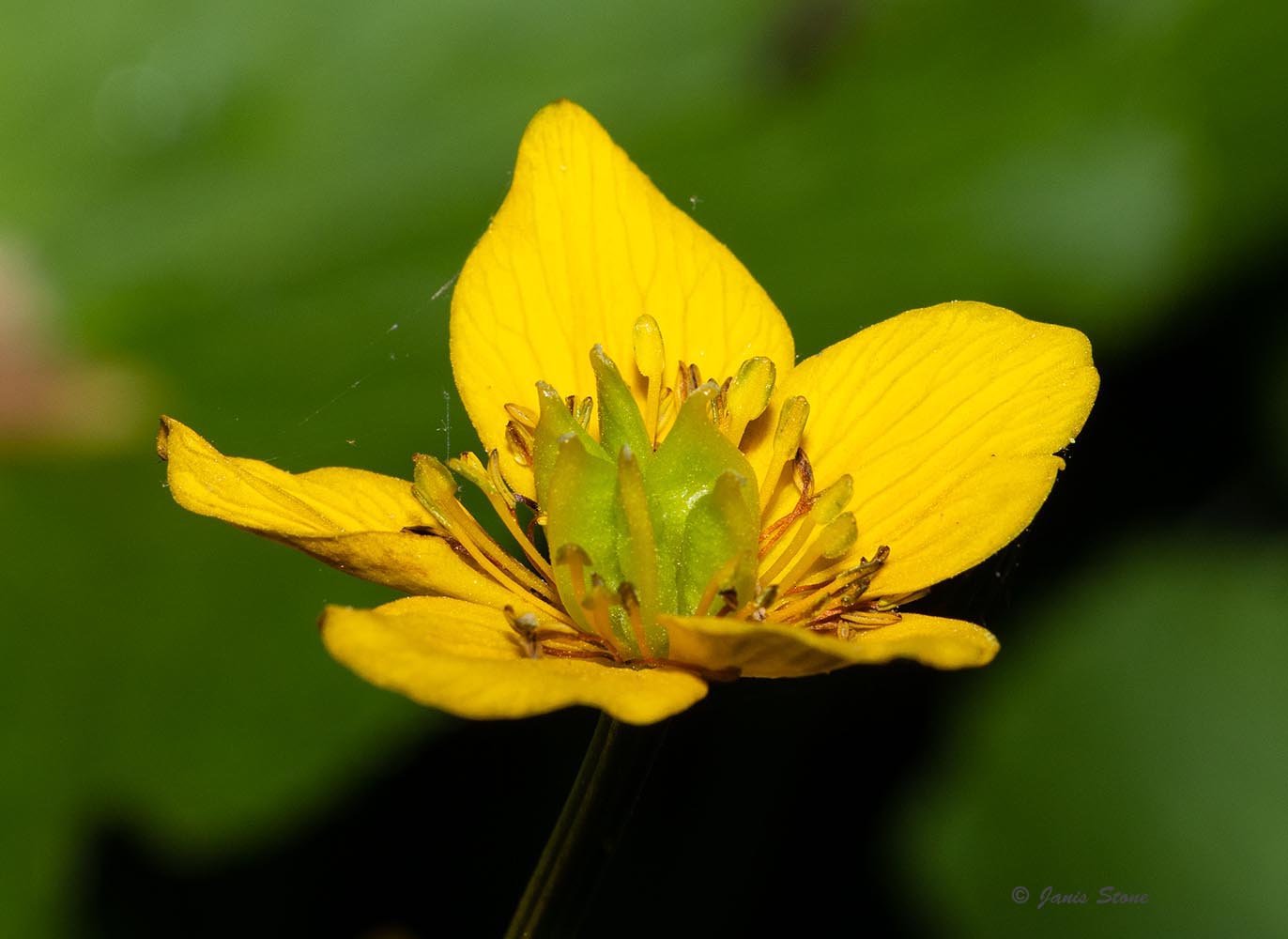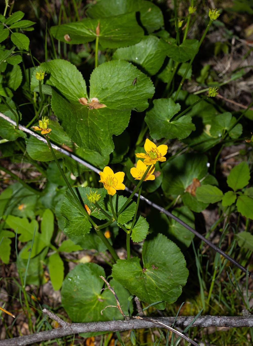 Marsh Marigold, with its bright yellow flowers and green violet-like leaves, is most often found in wet areas such as seepage swamps, fens, bogs, and along river banks. The flower petals have conspicuous nerves.