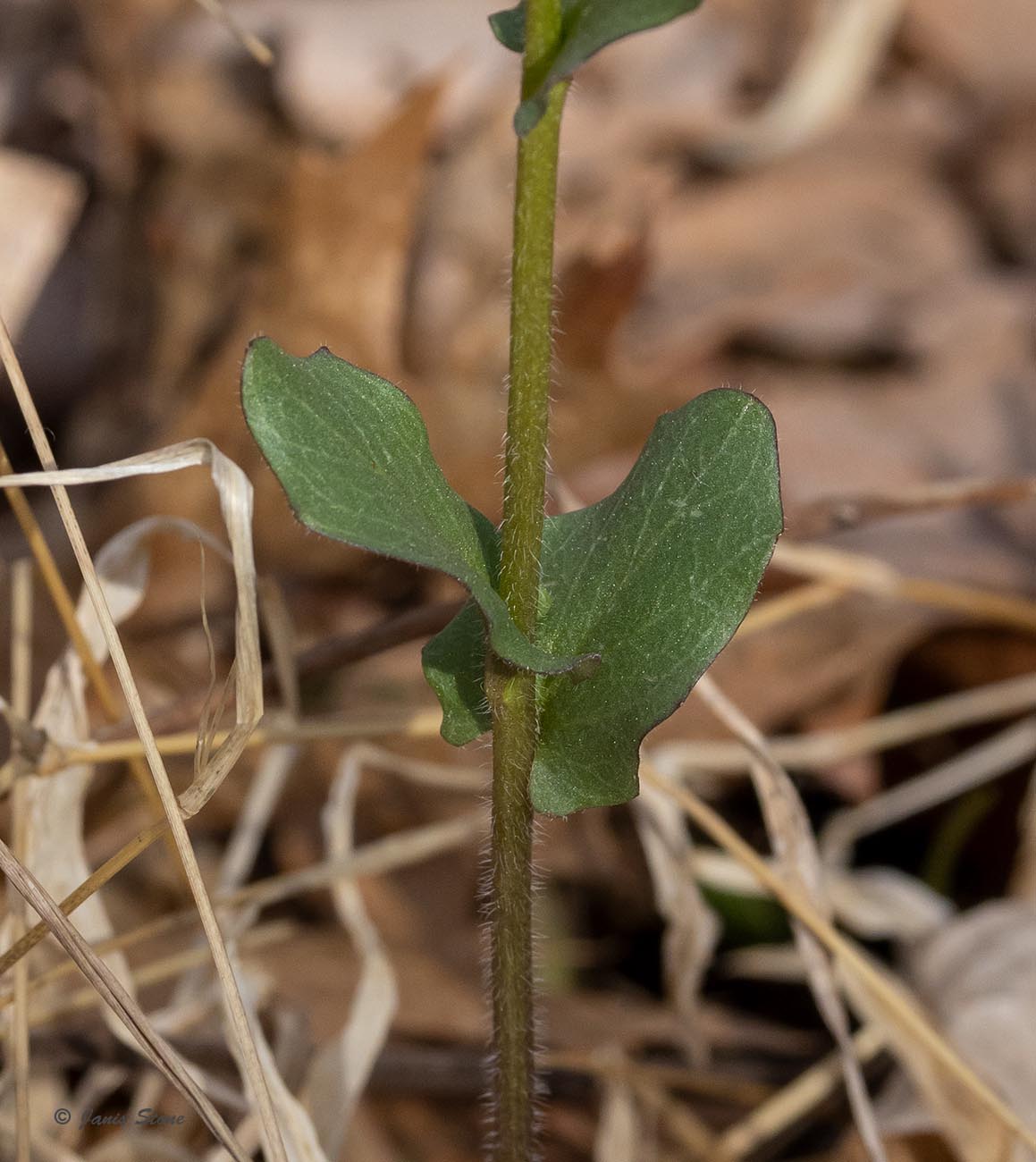 | basal leaves | blades 2.58 cm, oval or rotund to reniform, entire or repand, rarely purplish beneath, deciduous before anthesis | to 3 cm, orbicular or nearly so, purplish beneath, especially when in full sun, petiolate |