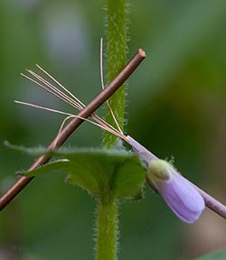 Identification Caution: Purple Cress (Cardamine douglassii) and Spring Cress (Cardamine bulbosa) are often nearly impossible to differentiate in the field. Many of their defining characteristics overlap, further complicated by them hybridizing in locations where they both can grow. Perhaps the most quoted source for their identification is a 1976 paper by Hart and Eshbaughi in the Journal of the New England Botanical Club1.