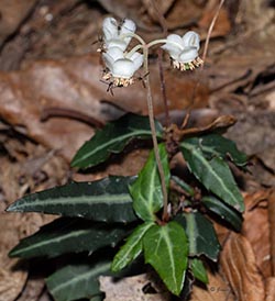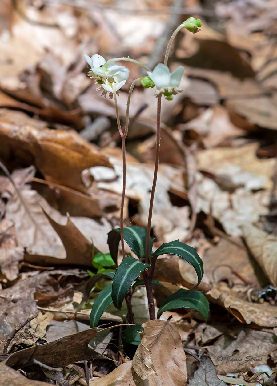 Striped Wintergreen's green leaves may be either striped or spotted, hence the ambiguity in its common name.