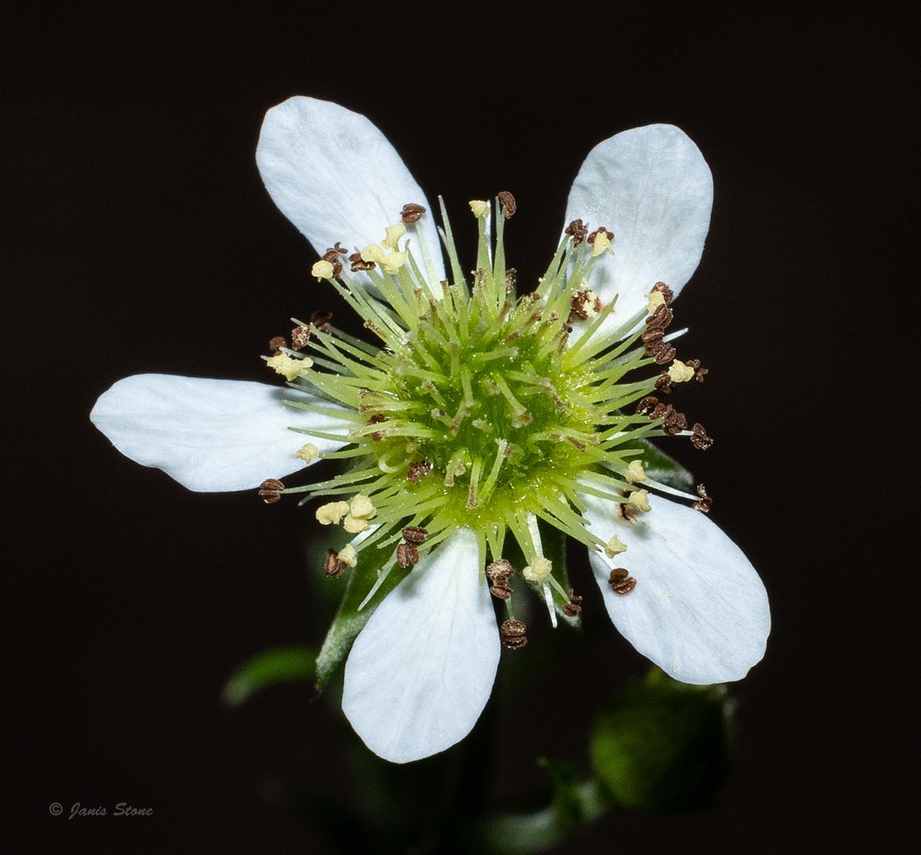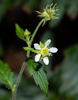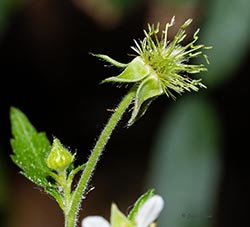 White Avens typically has alternate 3-leaflet compound leaves. Its flower's petals are widely separated, and you can usually see a pointed sepal in between each set of petals.