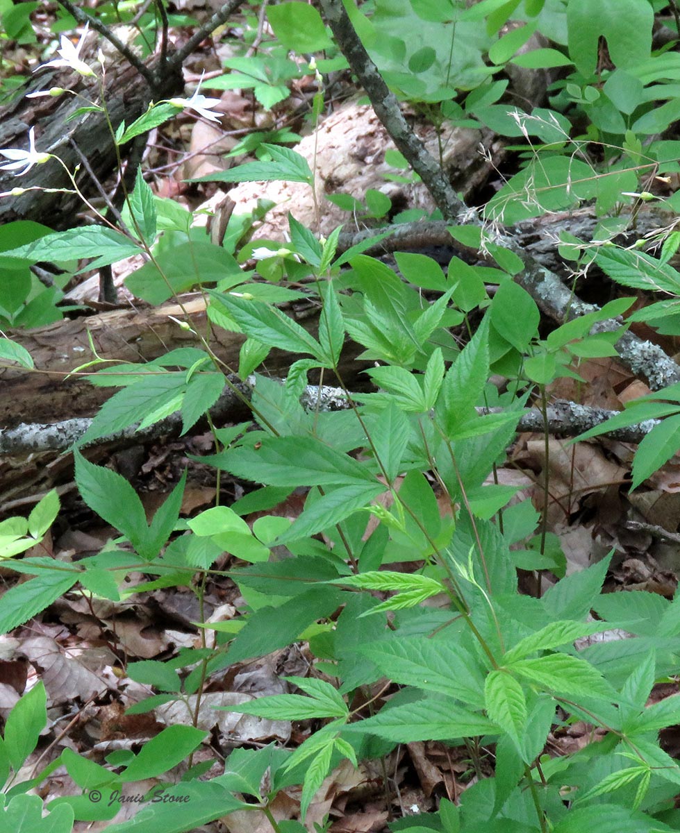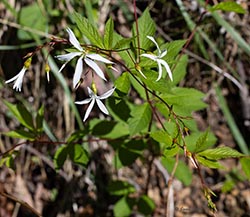 Bowman's Root has 3-lobed palmate leavees and narrow-petaled white to pink flowers.