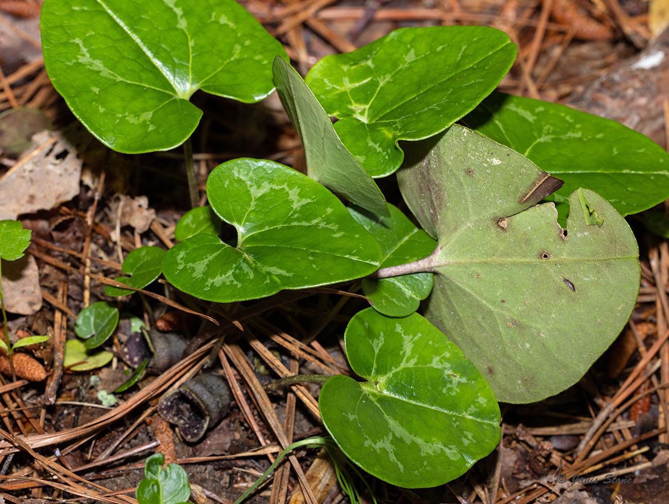 Weakley's 2025 Flora of the Southeastern United States1 differentiates between the two genera by noting that Hexastylis species' leaves are evergreen, glabrous, and not paired, whereas Asarum's leaves are deciduous, pubescent, and paired.