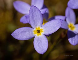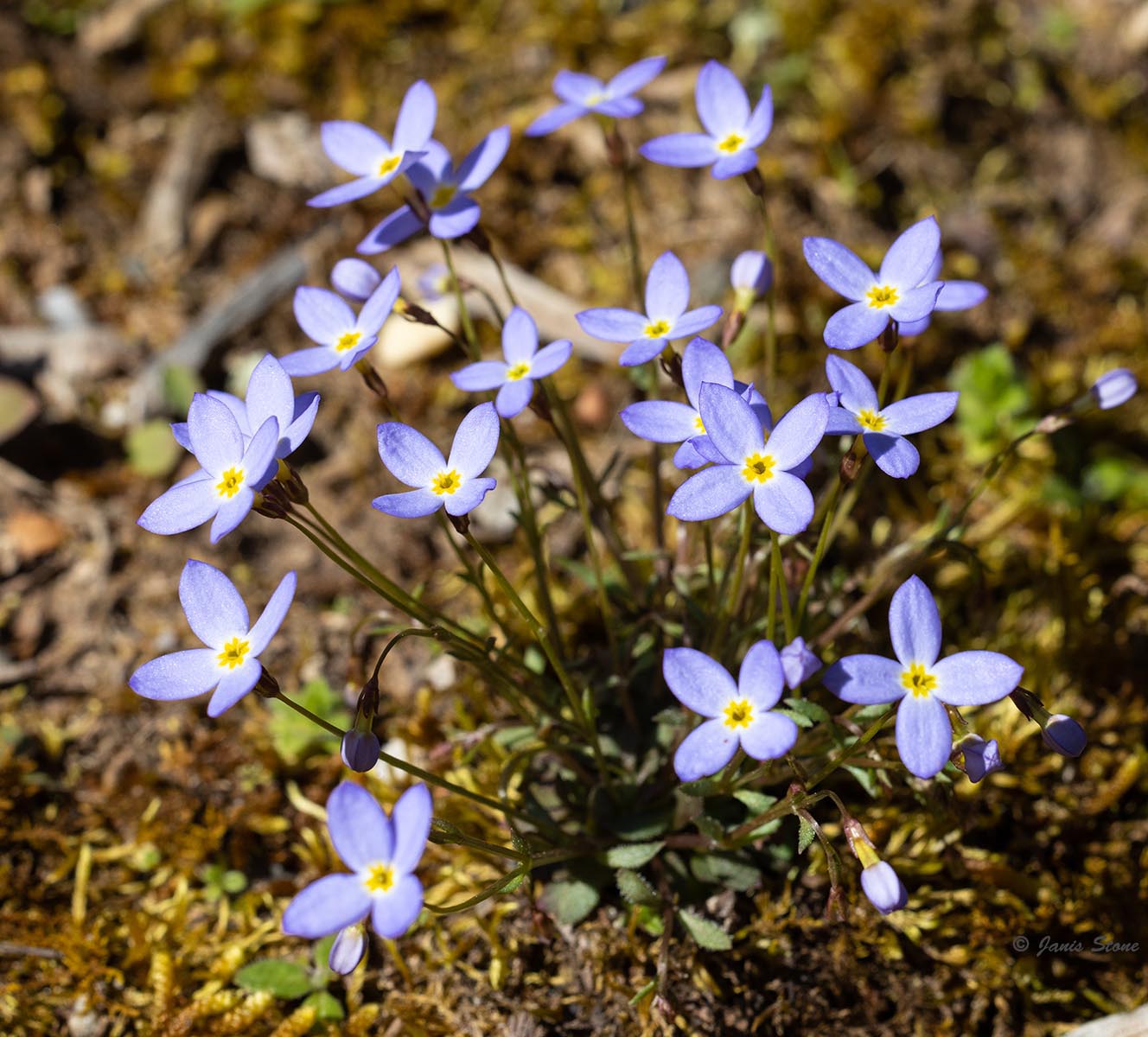 Our most common bluets, Common Bluets have pale azure-blue petals and a yellow center. The much less common Tiny Bluets (Houstonia pusilla) flowers have a purple-red and yellow center and bloom slightly earlier.