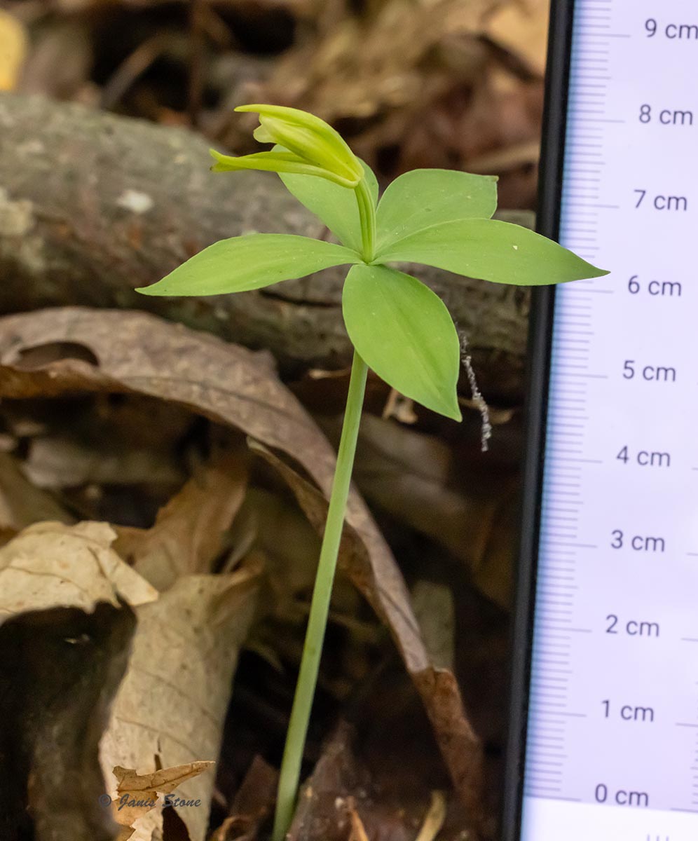 It is also similar to the Large Whorled Pogonia (Isotria verticillata) (in the same genus). The Small Whorled Pogonia lower part of its stem is pale green (not purplish) and is generally shorter (up to 25 cm high); many specimens are only 10-15 cm tall. The two species are most easily differentiated when in bloom. The Small Whorled Pogonia flower's sepals are green, not brownish, and the flower pedicel is shorter (at most 3 cm).