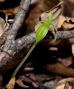 Small Whorled Pogonia's species epithet medeoloides reflects its similarity in form to Cucumber Root (Medeola virginiana).
