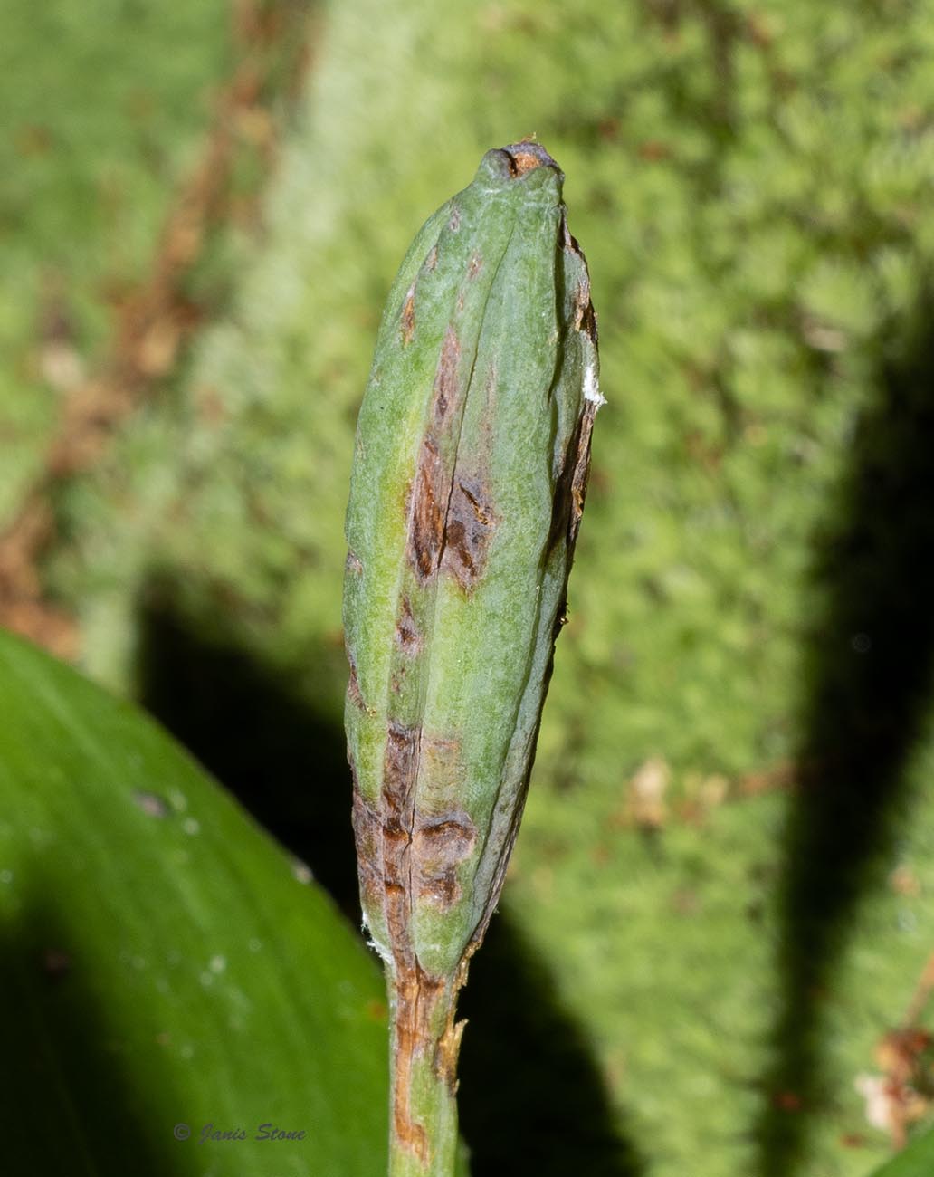 It is also similar to the Small Whorled Pogonia (Isotria medeoloides) (in the same genus). The Large Whorled Pogonia lower part of its stem is purplish (not green) and is generally taller (up to 35 cm high). The two species are most easily differentiated when in bloom. The Large Whorled Pogonia flower's sepals are brownish, not green, and the flower is separated from the whorled leaves by a longer pedicel (2-5 cm).