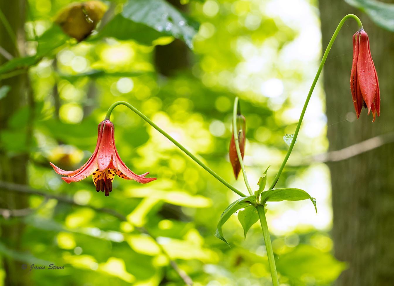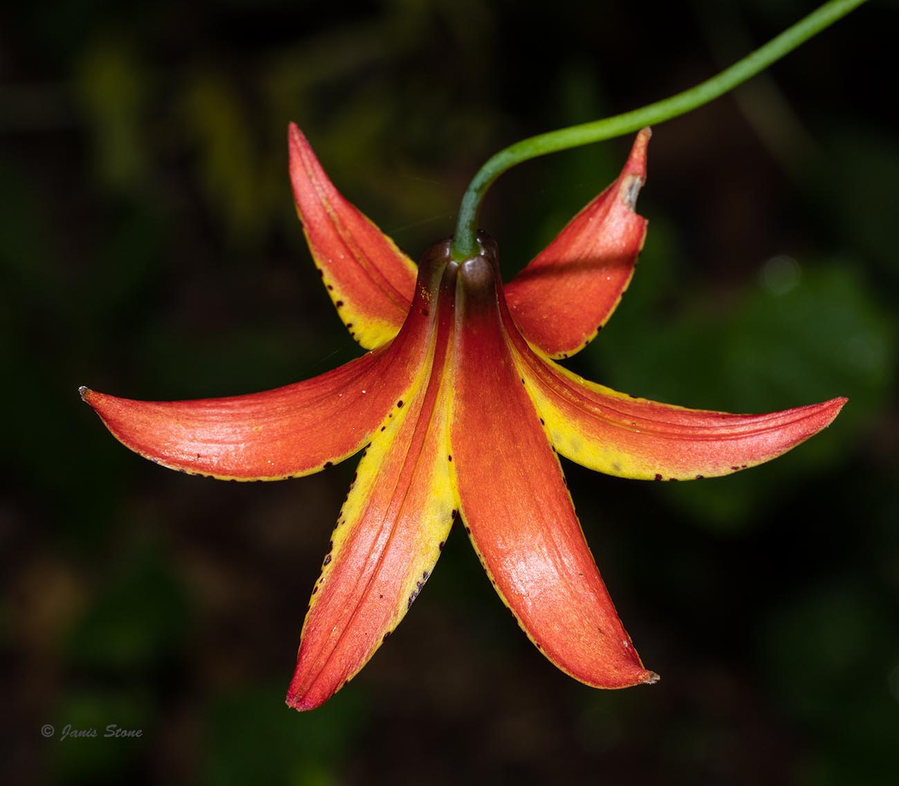 Canada Lily's nodding flowers range in color from brick-red to yellow. Its tepals are reflexed from their middle and have purple or brown spots on the inside for at least half of their length. Its leaves are typically in wholes of 415 leaves along the stem.