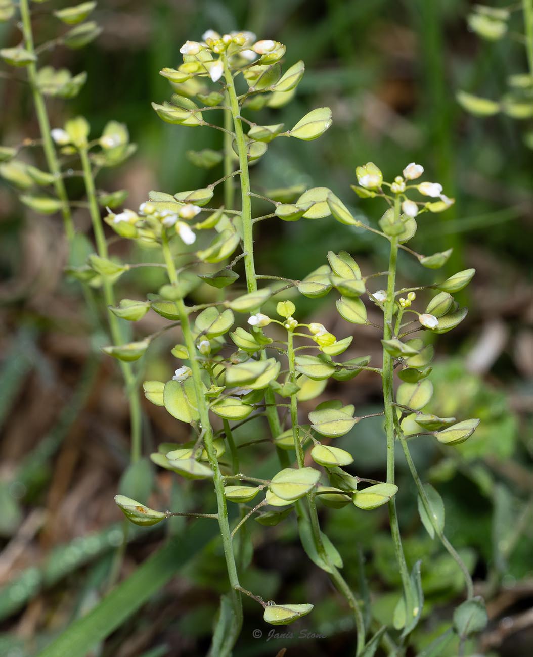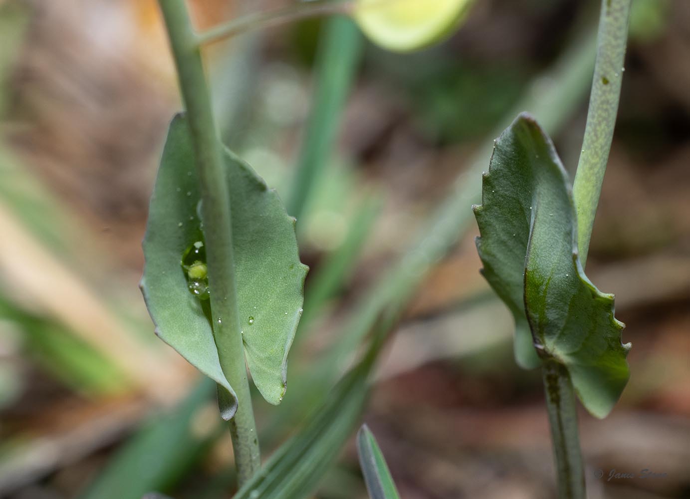 Perfoliate Penny-cress is an annual plant, native to Eurasia and North Africa. It bears small white flowers at the top of a single stem. Its basal leaves are ovate, with dentations. Its stem leaves are lanceolate and jagged, with their bases wrapped around the stem (i.e., perfoliate).