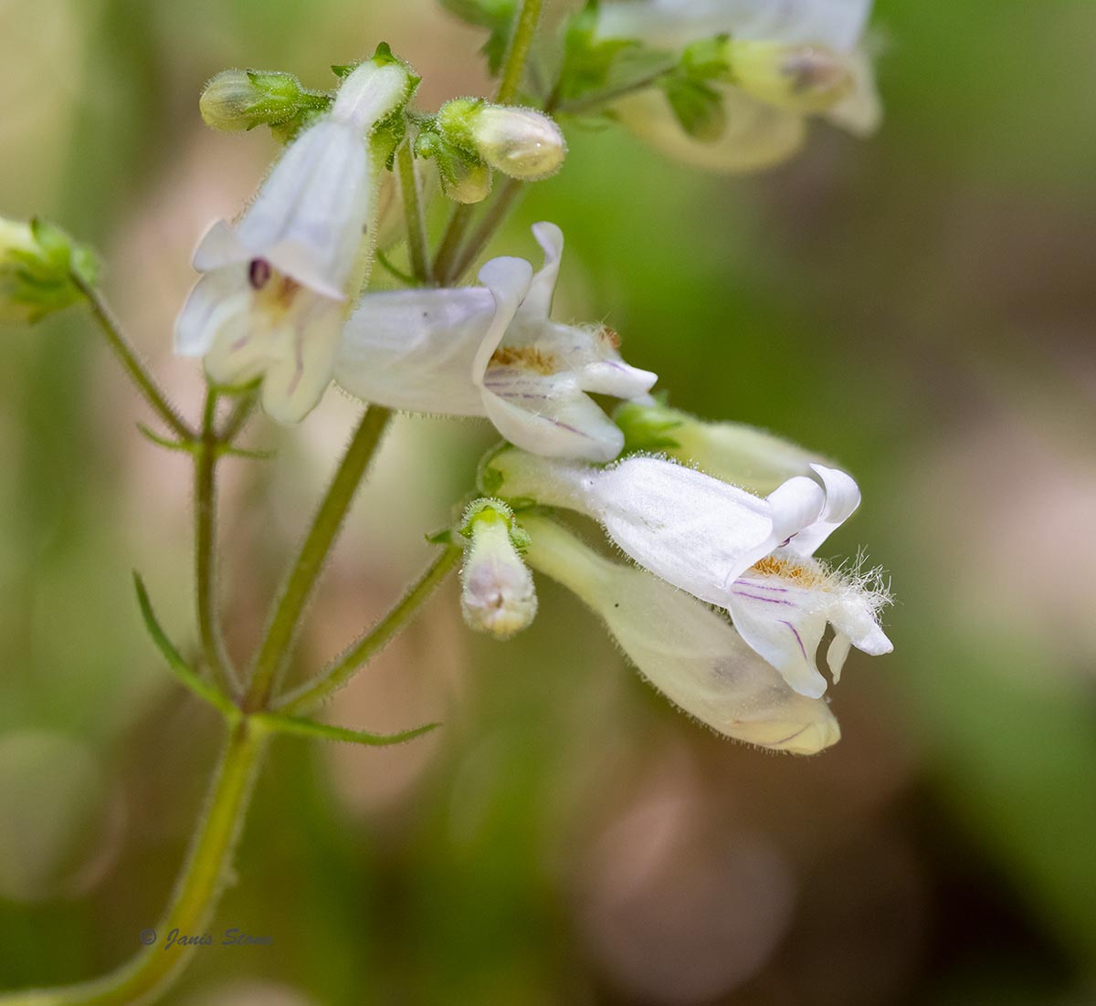 Pale Beardtongue's corolla is white with fine purple lines. Its corollas have an open throat, with their lower lobes projecting beyond the upper lobes.
