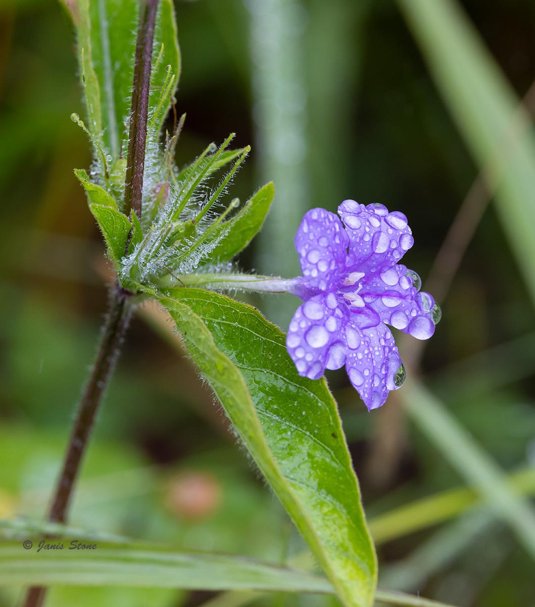 Carolina Wild-petunia has the classic look of petunias we've seen in our gardens. Compared to Smooth Wild-petunia (Ruellia strepens), it has much hairier stems that sometimes appear to be almost gray. It also has almost stalkless flowers, and a broader woodland habitat range.