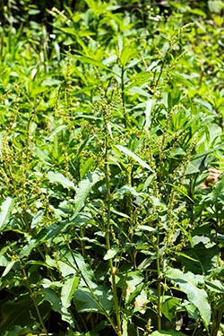 Curly Dock has large (1435 cm long) leaves with distinctive curly/waved edges. Its flowering stalk bolts up in late spring from a rosette of basal leaves. Each yellowish or reddish green flower is about 3mm long and consists of 3 inner sepals, 3 outer sepals, 3 styles, and an ovary. Each plant has both perfect (bisexual) and pistillate (female), which also have 6 stamens.