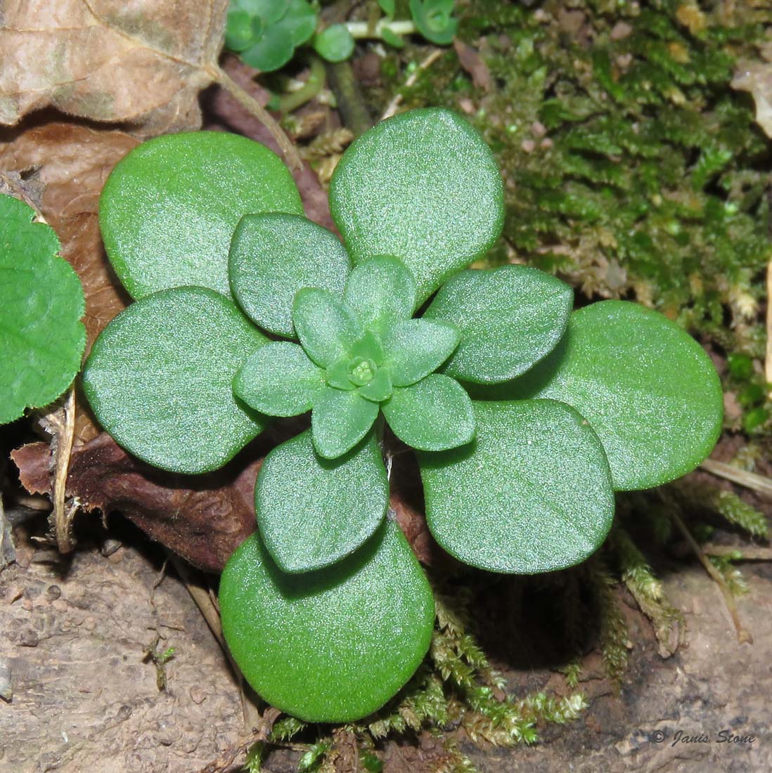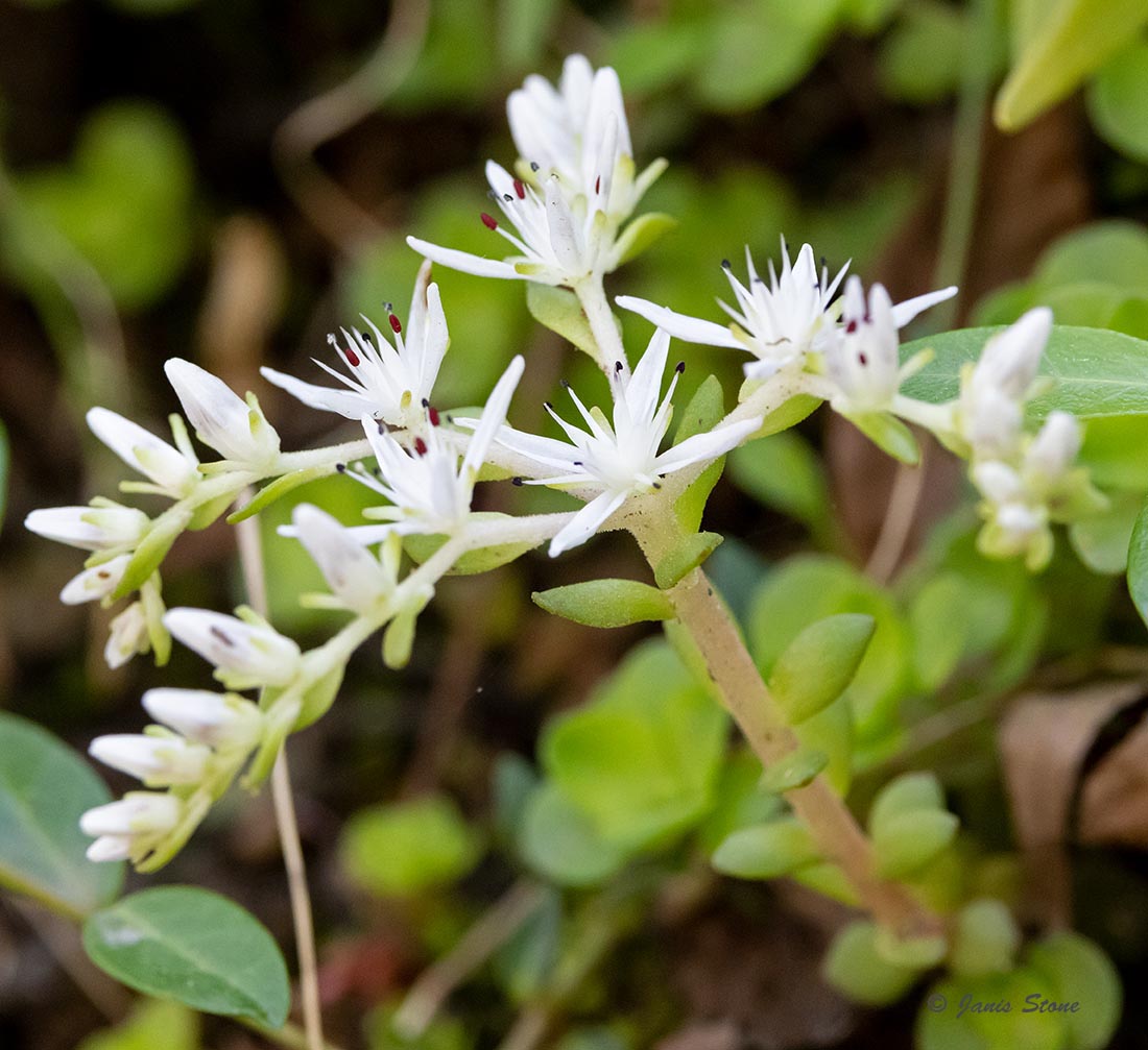 Wild Stonecrop has white flowers, and succulent leaves whorled in groups of three.