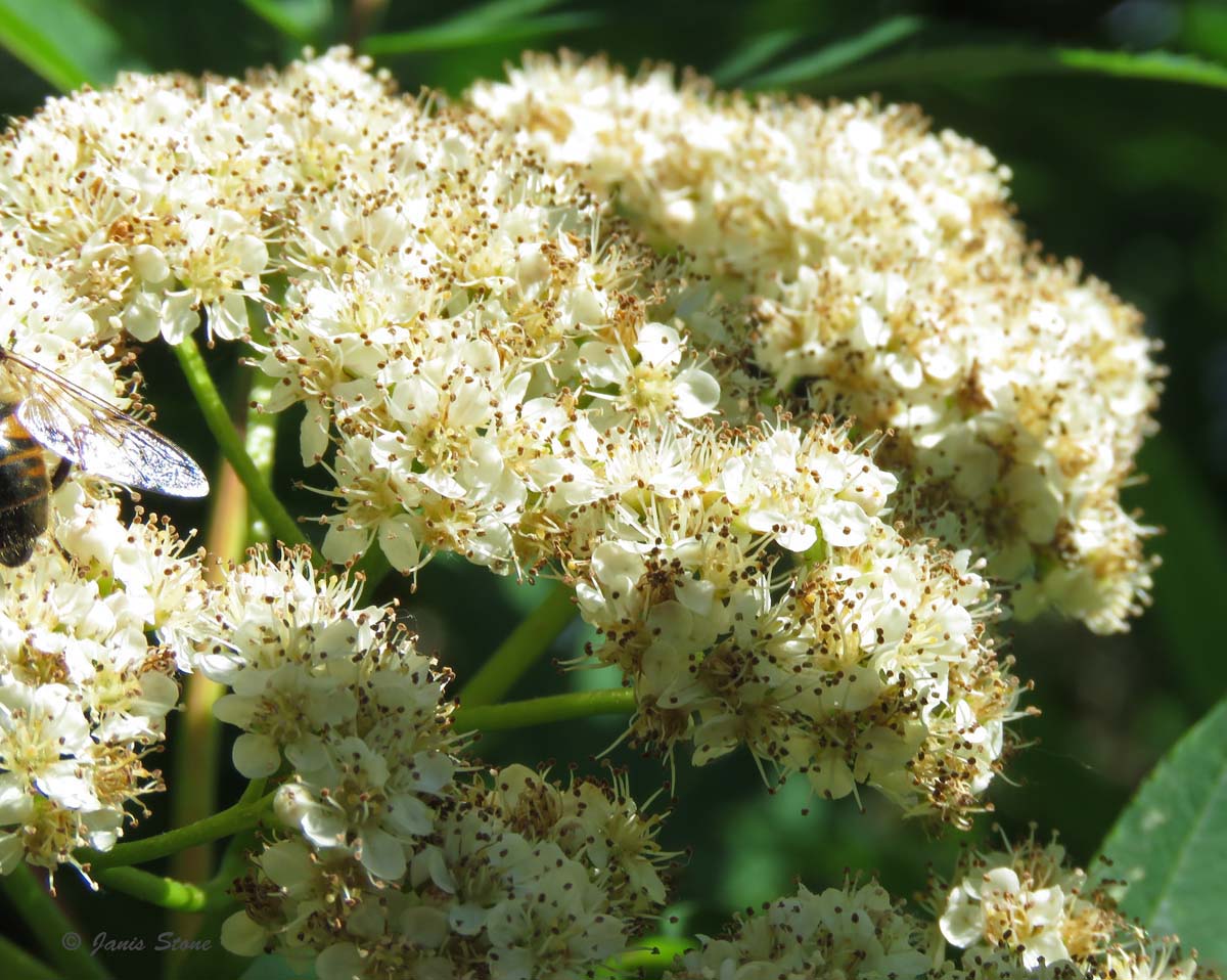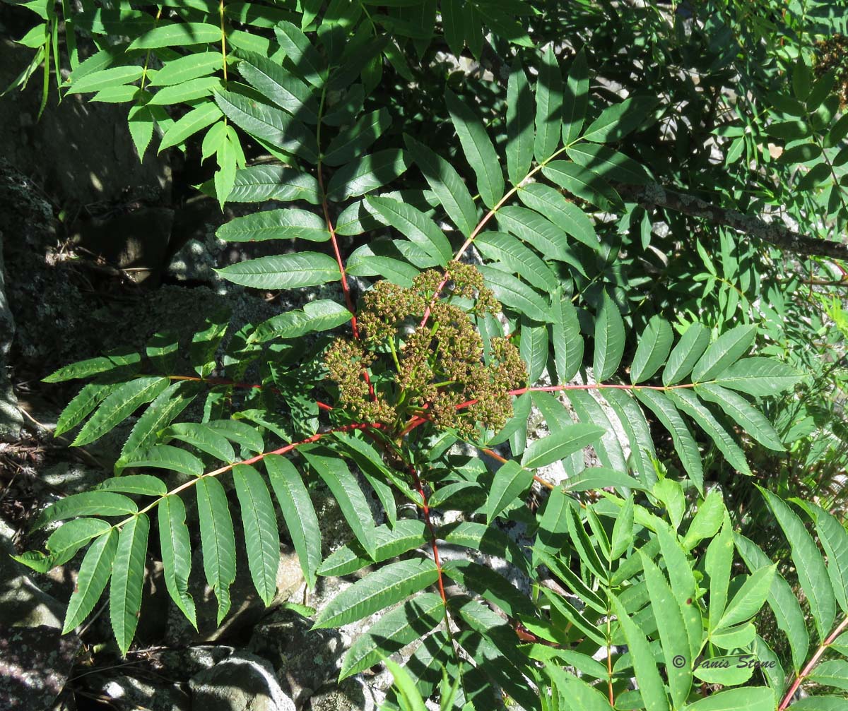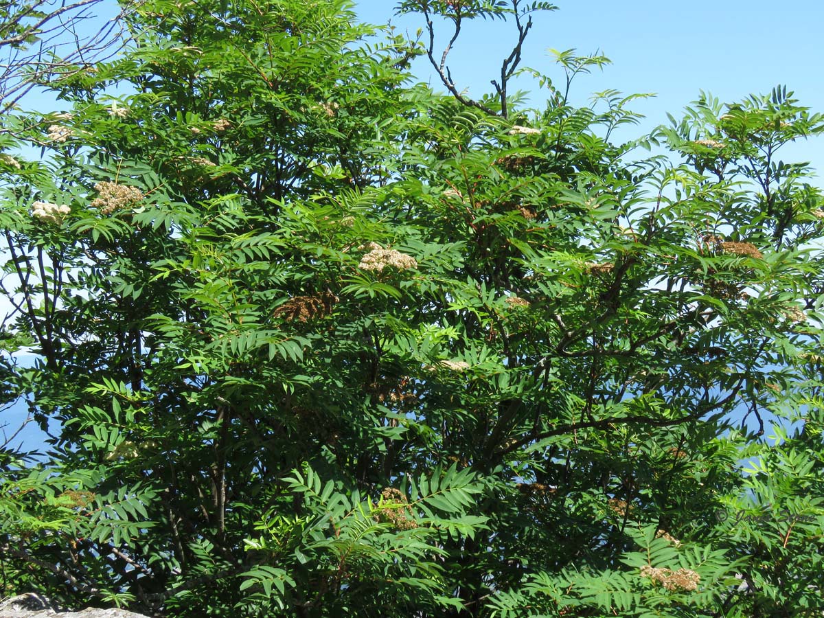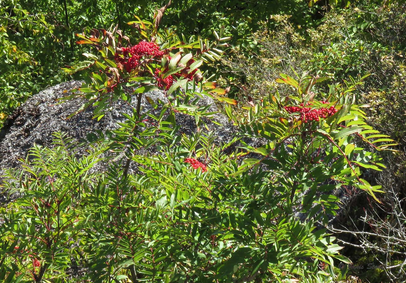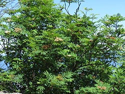 American Mountain-ash can be found in the higher elevations of the mid-Atlantic area and further north as either coarse shrubs or trees up to 15m high. Its white flowers are borne in flat compound cymes 620cm across. In autumn, it forms red berry-like pomes that persist through winter.