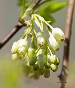 Bladdernut's most distinctive characteristic is the bladder-like shape of its fruits, hanging like small pale lanterns in its branches. Leaves are opposite and divided into three leaflets (looking disturbingly at first glance like Poison Ivy!), with each leaflet up to 10 cm long and 5 cm broad, with a finely serrated margin. The leaves are bright green in the spring, turning dark green in the summer.