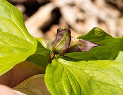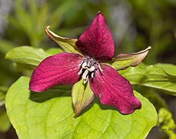 Red Trillium has one nodding flower, with an unpleasant odor (hence the alternative common name Stinking Benjamin). Note that its flowers have a long (1-9cm) pedicel.