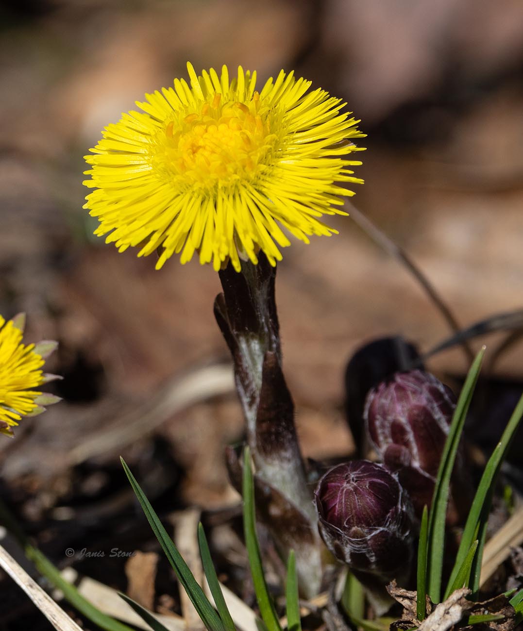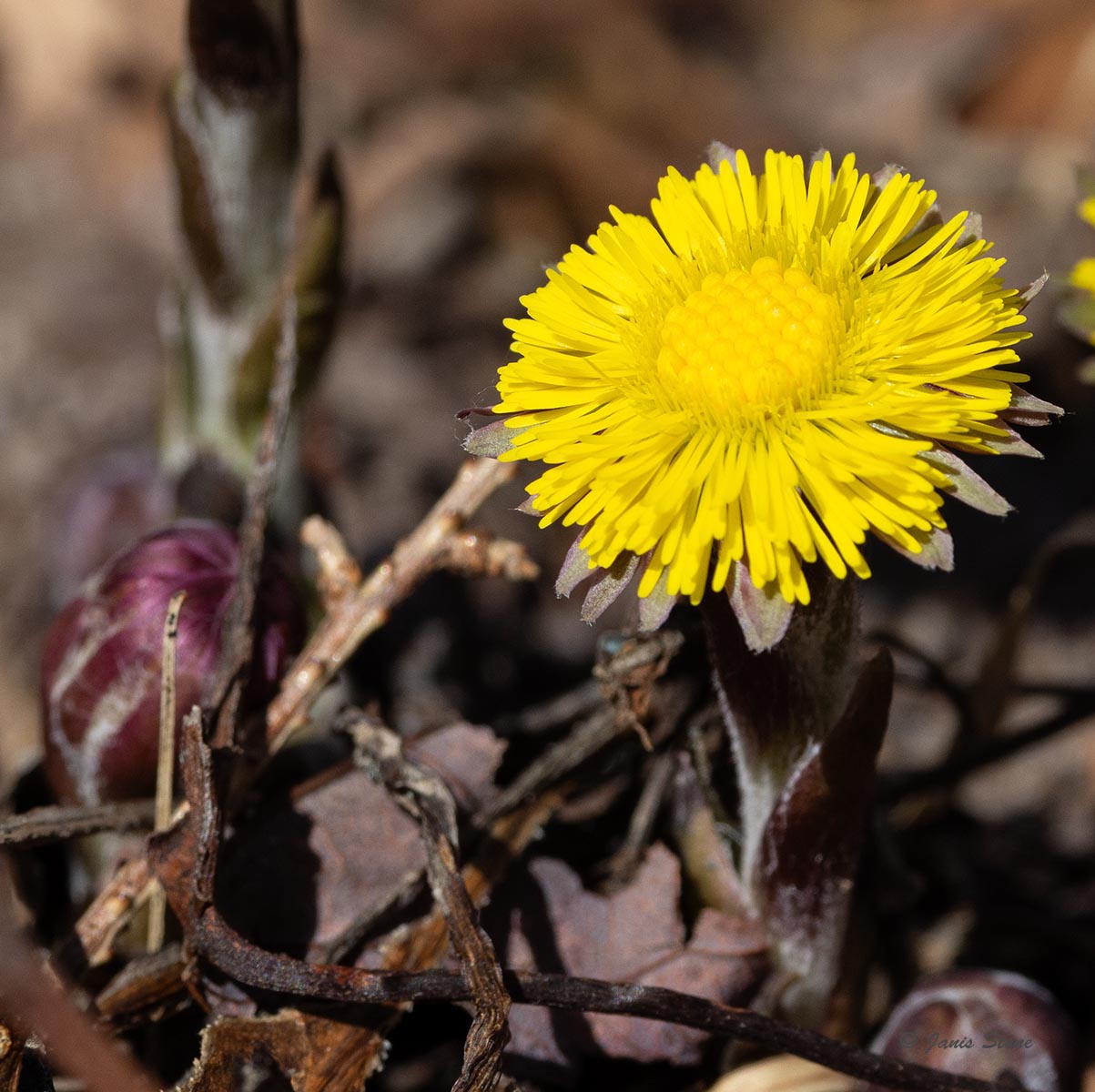 Cotlsfoot's flowers resemble common dandelions about 1.5 - 2.5 cm in diameter, but no leaves are present when flowers bloom. Leaves later emerge that are purportedly shaped like a colt's foot. Like dandelions, its seeds are dispersed by the wind and can travel for miles; they can remain dormant in the soil for long periods, awaiting a disturbance to stimulate them to germinate at any time in the growing season.