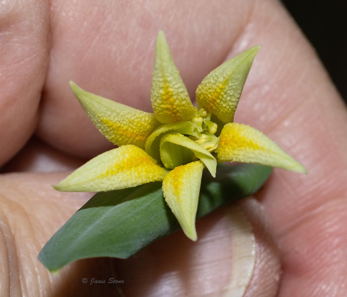 The genus is named Uvularia because the flower hangs down like the uvula in the back of your throat; the species name perfoliata reflects the fact that the stem seems to perforate the base of the leaves.
