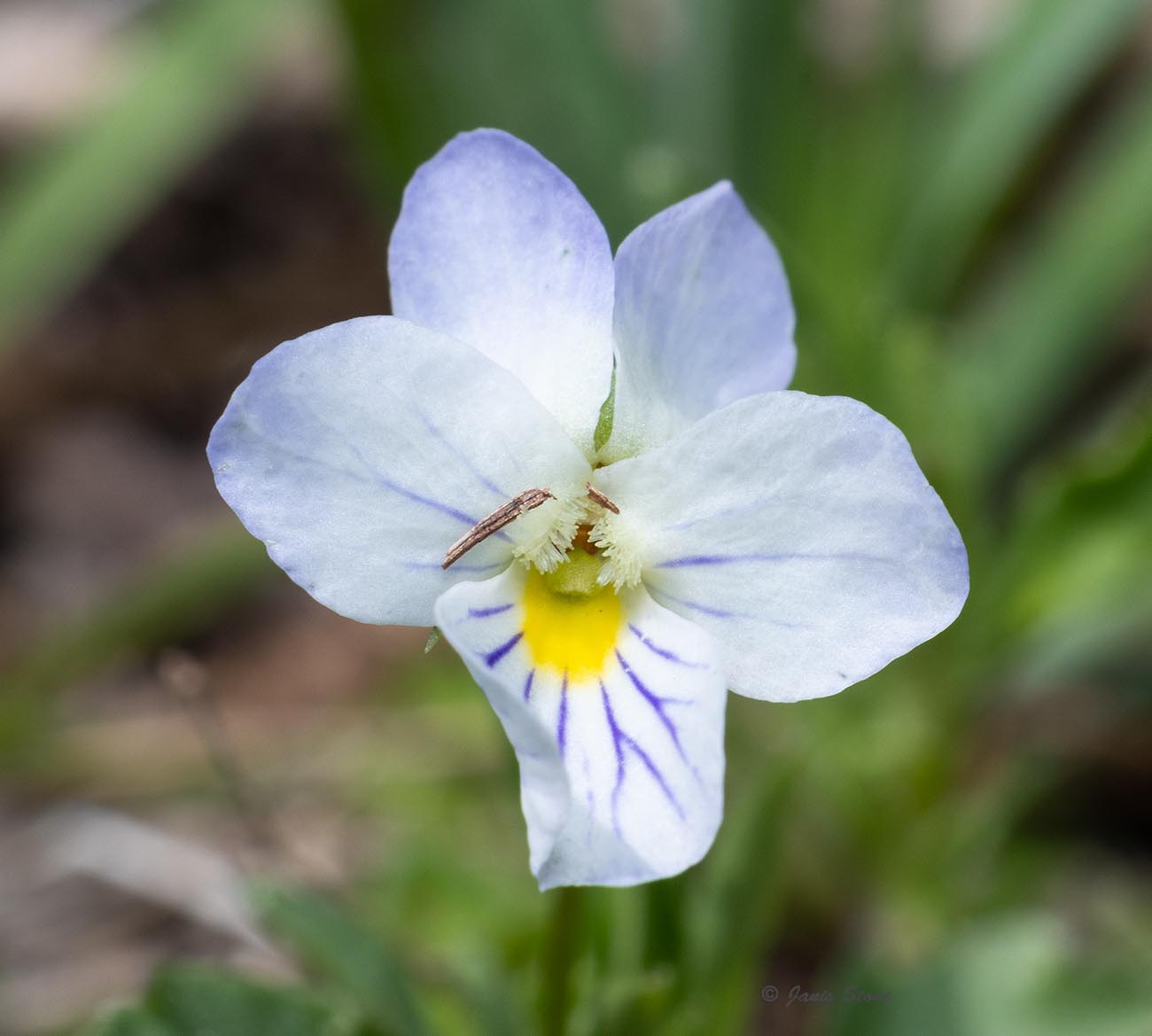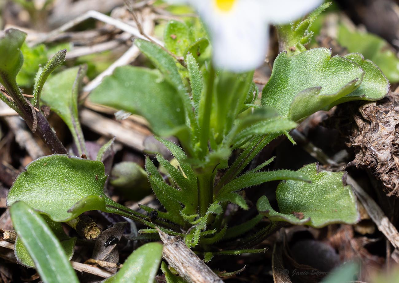 Field Pansy has above ground stems and blue-white flowers with blue veins. The lowest petal usually has yellow near its base.